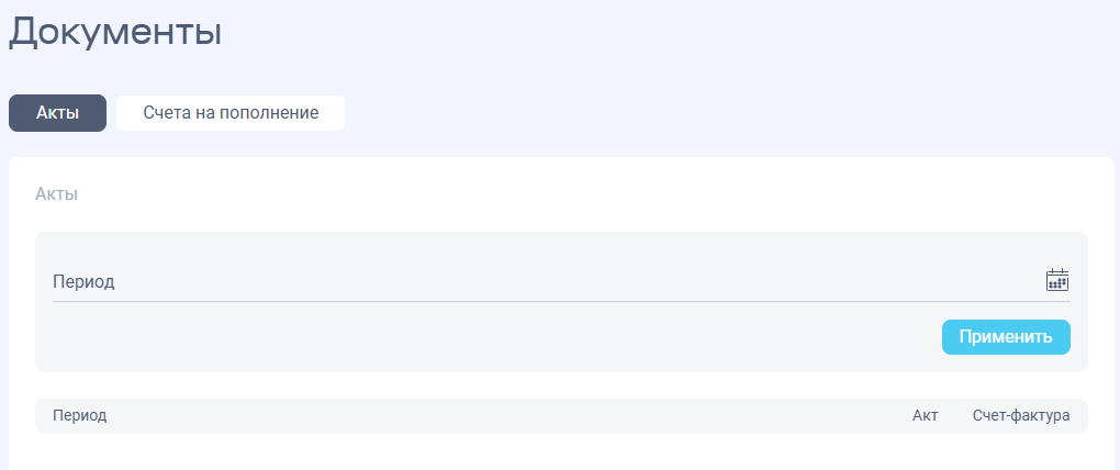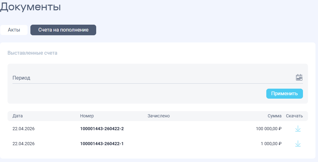 Все сформированные и неоплаченные счета для авансовых платежей доступны в разделе Документы → Счета на пополнение.
