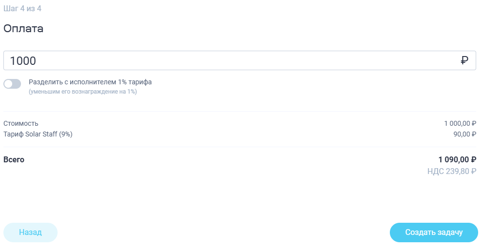 Задача может быть создана только в валюте вашего баланса. Сумма с комиссией Solar Staff рассчитается автоматически. Чтобы узнать размер комиссии сервиса, напишите нам в чат.