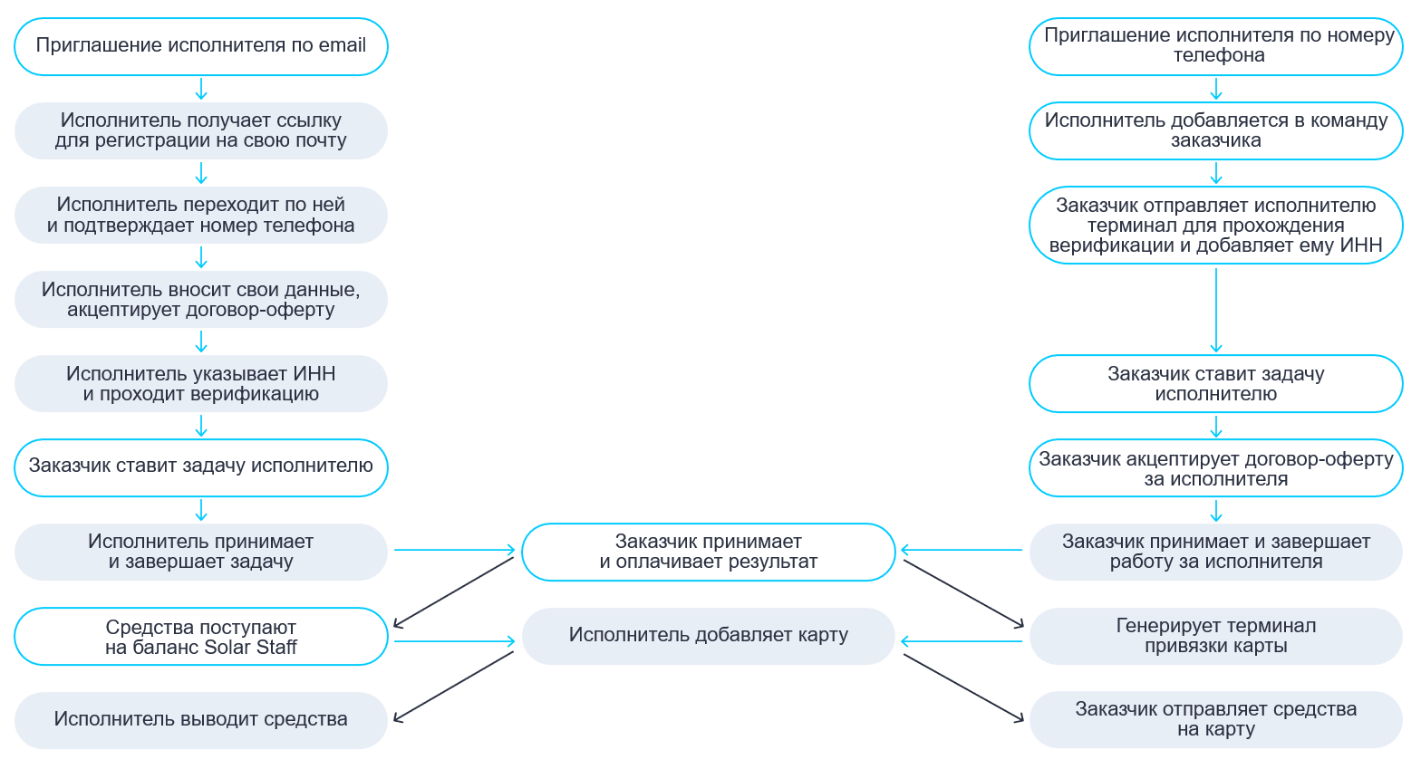 Поддержка всех типов исполнителей — работайте с физическими лицами, самозанятыми, ИП и используйте различные платежные методы (банковские карты, электронные кошельки, банковские счета)